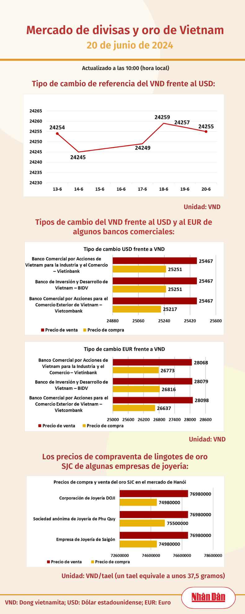 viernes, octubre 24, 2025 10:10 Infografía: Mercado de divisas y oro de Vietnam -24 de octubre de 2025 El dólar estadounidense se cotiza hoy en 24098 dongs vietnamitas (VND) (Referencia del Banco Estatal de Vietnam)