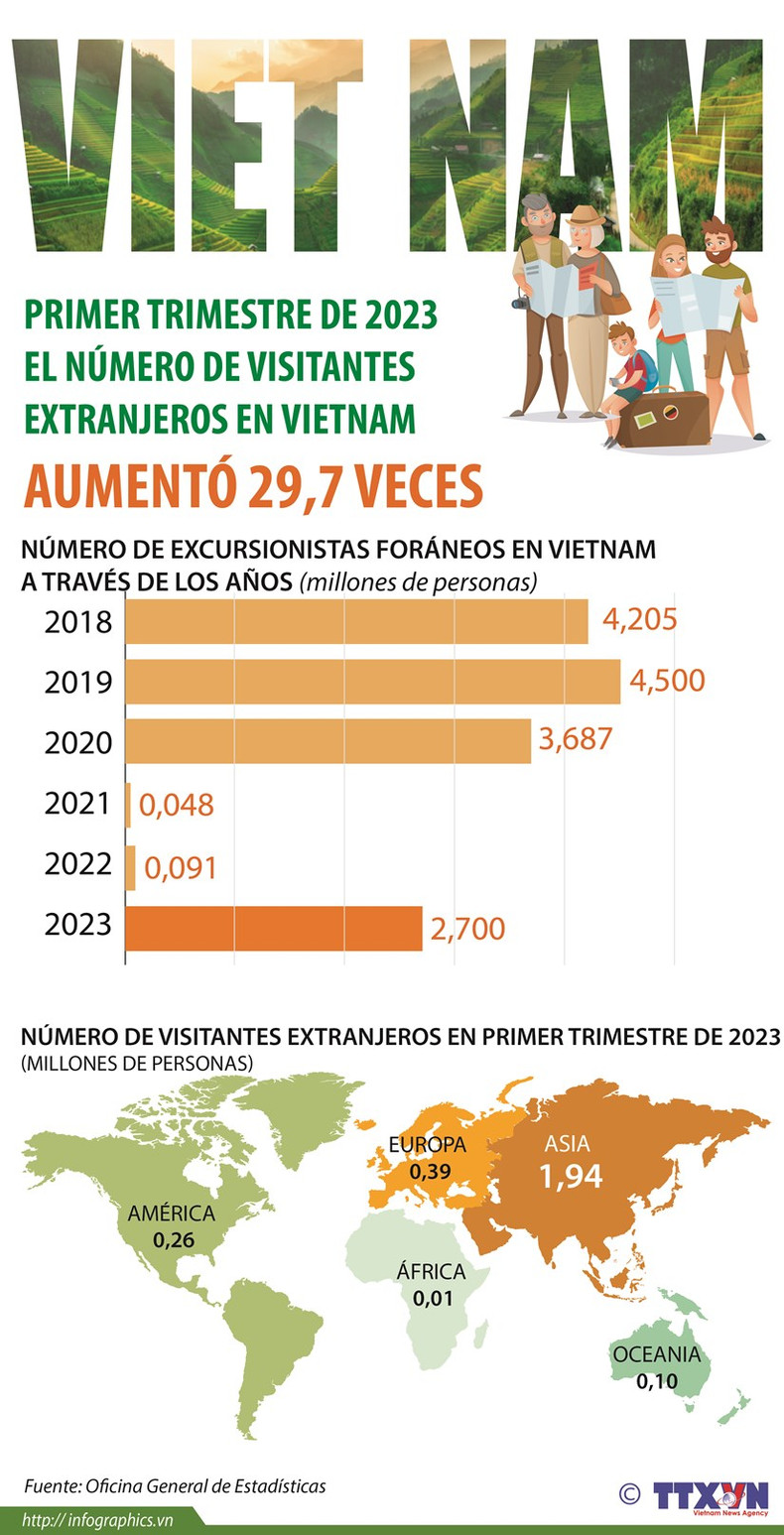 El número de visitantes extranjeros en vietnam aumentó 29,7 veces durante los primeros tres meses de 2023.