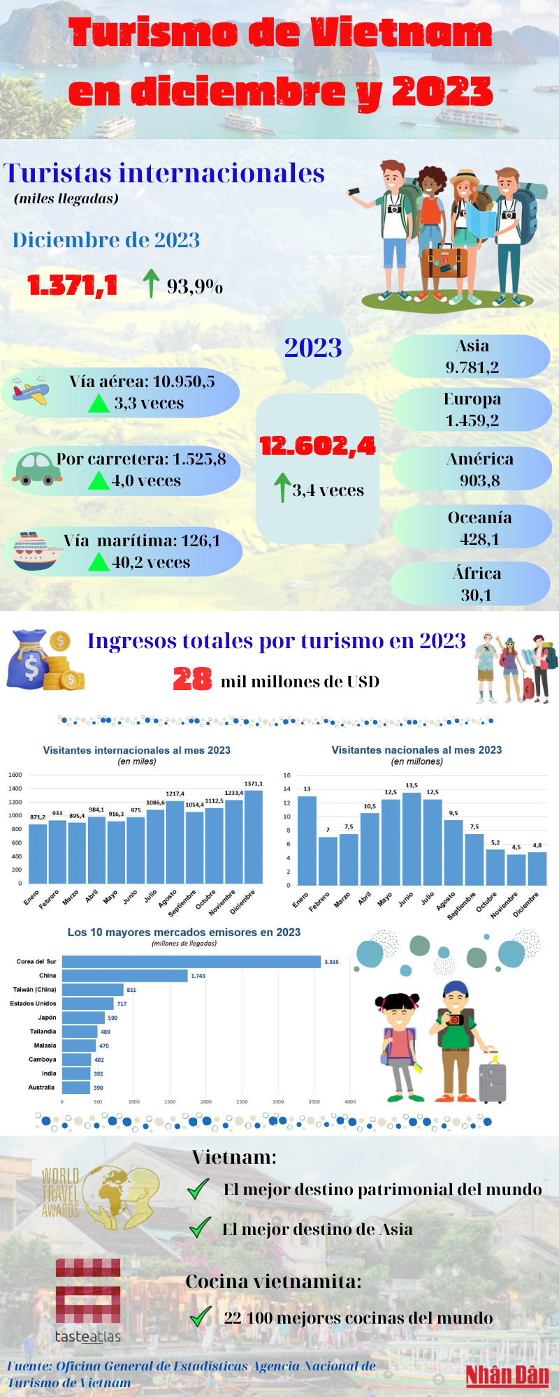 En 2023, la industria turística de Vietnam atendió a 12,6 millones de visitantes internacionales, superando en un 57 por ciento el objetivo original y alcanzando la meta fijada de 12 a 13 millones. Los turistas nacionales alcanzaron los 108 millones, superando el plan en un 6 por ciento. Los ingresos totales por turismo se estiman en 28 mil millones de dólares, superando el plan en un 4,3 por ciento.