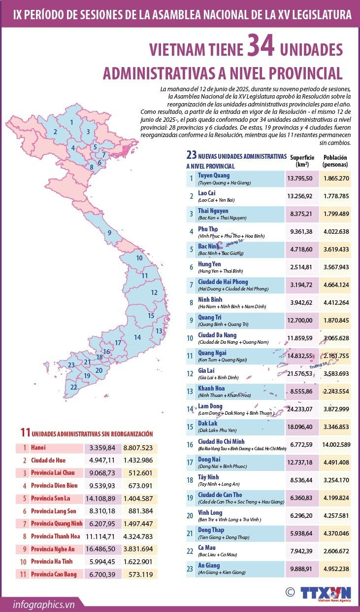Vietnam aprueba una histórica reorganización territorial y queda conformado por 34 unidades administrativas: 28 provincias y 6 ciudades a partir del 12 de junio de 2025.