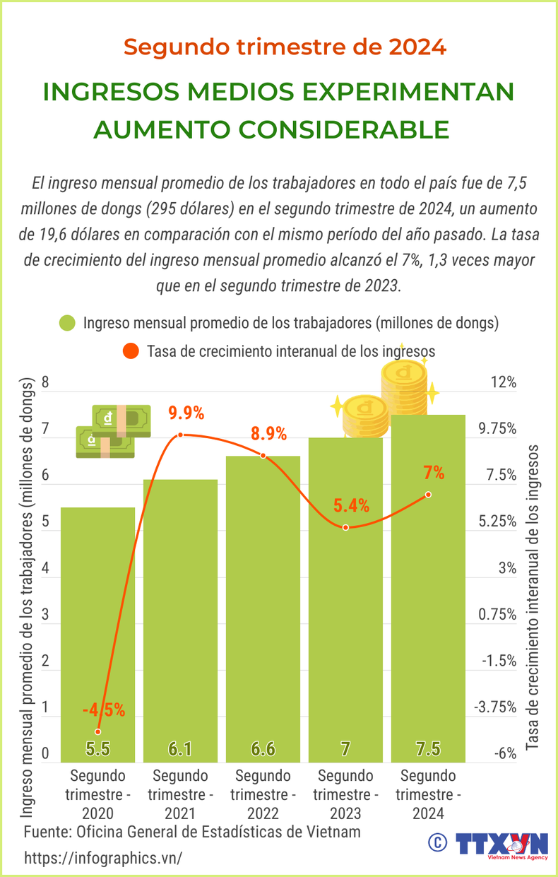 El ingreso mensual promedio de los trabajadores en todo el país fue de 7,5 millones de dongs (295 dólares) en el segundo trimestre de 2024, un aumento de 19,6 dólares en comparación con el mismo período del año pasado. La tasa de crecimiento del ingreso mensual promedio alcanzó el 7%, 1,3 veces mayor que en el segundo trimestre de 2023.