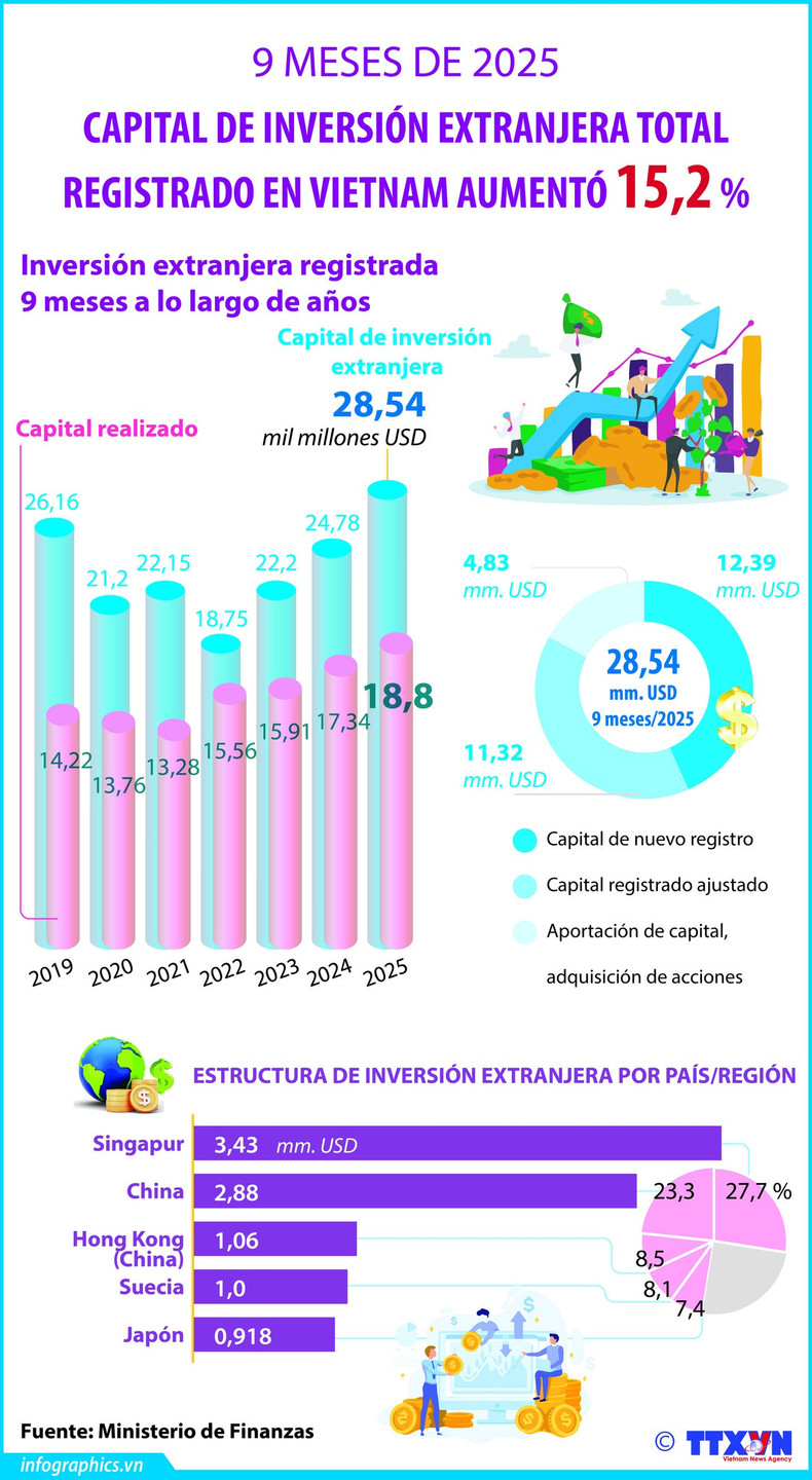 Hasta el 30 de septiembre de 2025, el capital total de inversión extranjera registrado en Vietnam - incluidos los nuevos registros, los ajustes de capital y las contribuciones de capital o compras de acciones por parte de inversores extranjeros - alcanzó los 28,54 mil millones de dólares, lo que representa un aumento del 15,2 por ciento en comparación con el mismo período del año anterior.