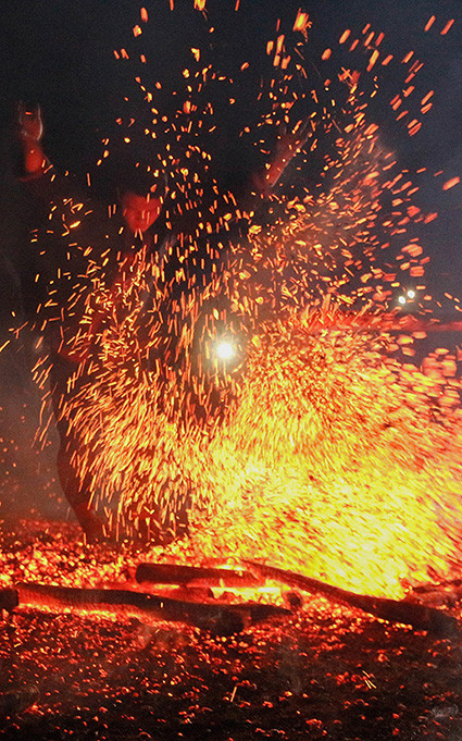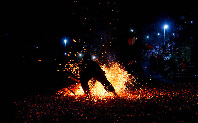 Los jóvenes descalzos se inclinan, hacen rayuela o saltan alrededor de las llamas. Comienzan introduciendo las manos al fuego y luego dan un brinco en la lumbre.