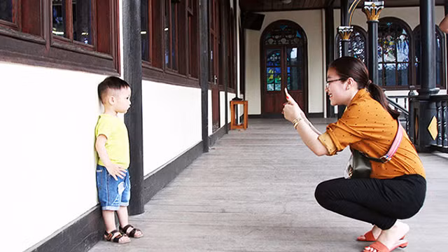 Madre e hijo toman fotos en un rincón de la iglesia.