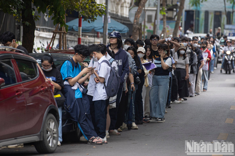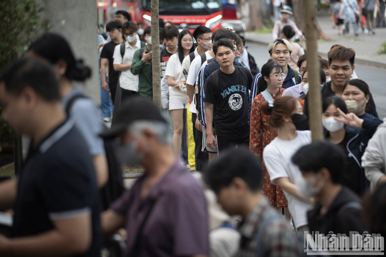 | Muchos jóvenes hacen una larga fila frente a la sede del periódico Nhan Dan para tener en sus manos el suplemento especial. |