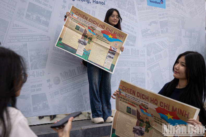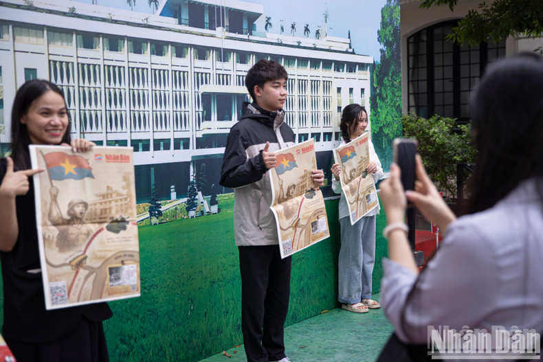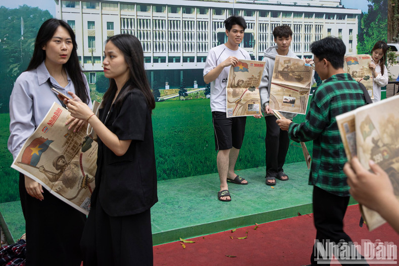 | Los estudiantes explican a los turistas extranjeros sobre el evento especial del periódico Nhan Dan. |