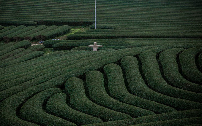 El rocío matinal embellece las colinas de té, convirtiéndolas en una pintura de irresistible belleza.