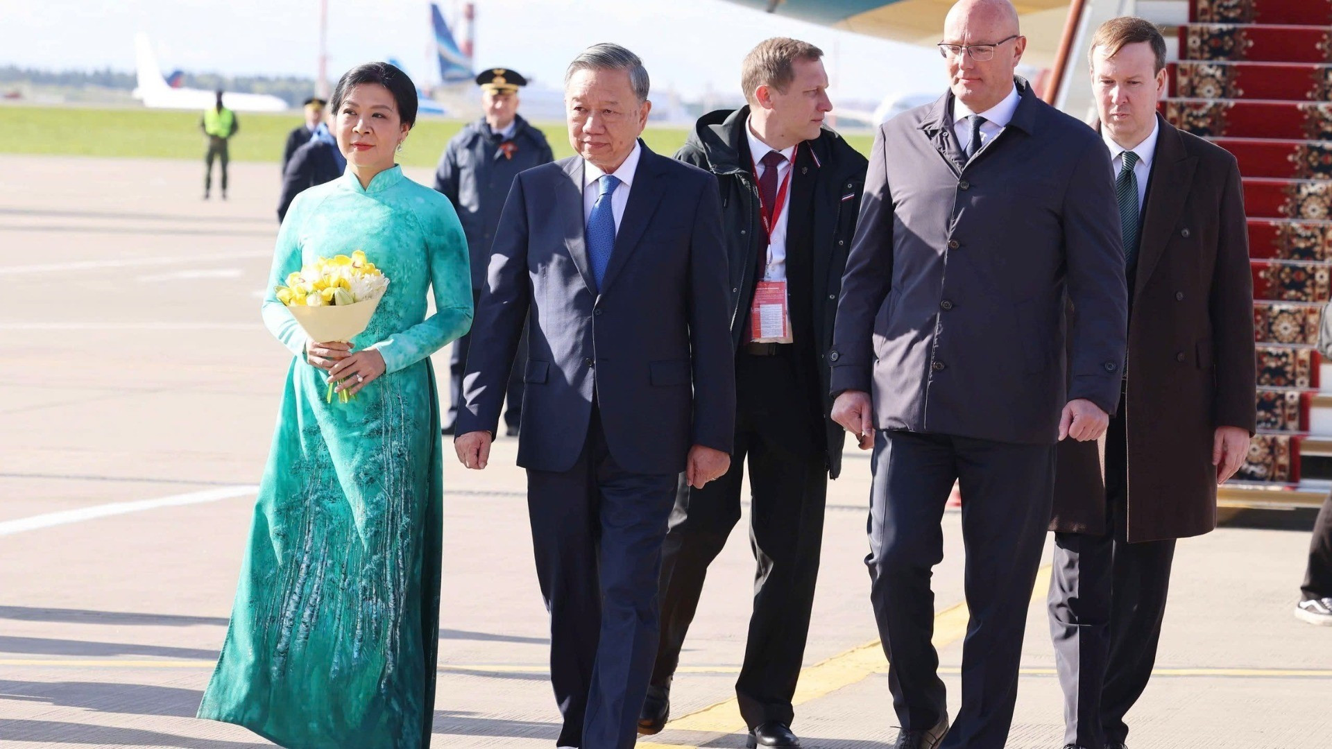 | Funcionarios de Rusia reciben al secretario general To Lam y a su esposa en el aeropuerto Vnúkovo 2, en la capital Moscú. |
