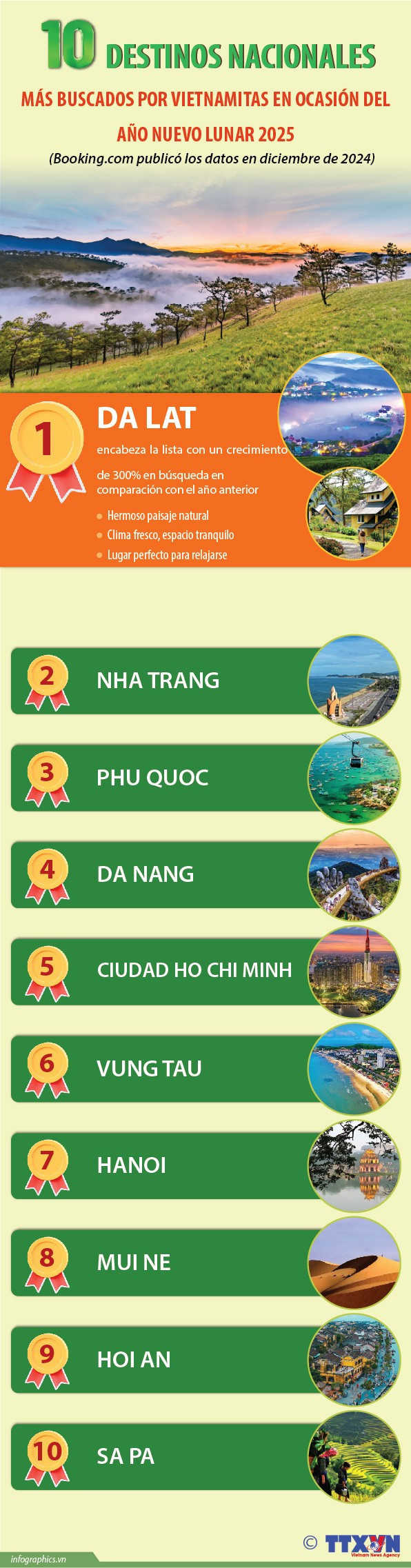 Booking.com, una de las principales plataformas de viajes del mundo, anunció los 10 destinos nacionales más buscados por los turistas vietnamitas del 24 de enero al 9 de febrero de 2025 con motivo del Año Nuevo Lunar 2025.