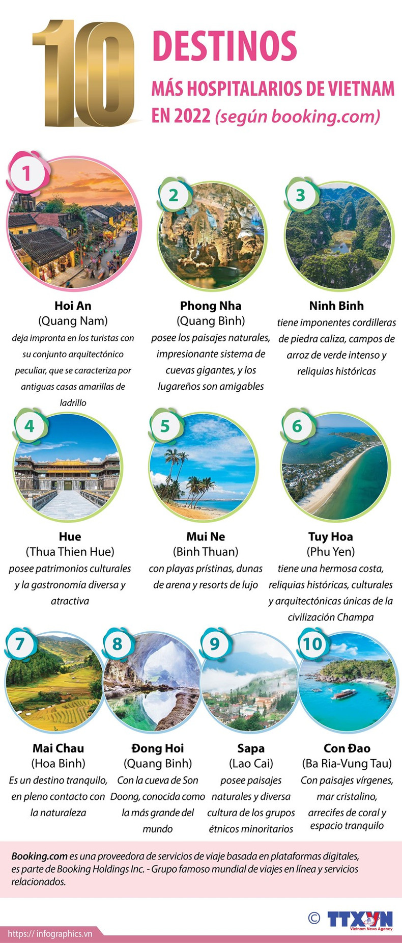 El sector turístico de Vietnam entró oficialmente en la etapa de recuperación después de una larga pausa a causa de la pandemia de Covid-19. Reconociendo un aumento en la demanda de búsqueda de destino, la plataforma de servicios turísticos en línea Booking.com anunció los 10 destinos turísticos más hospitalarios en Vietnam en 2022.