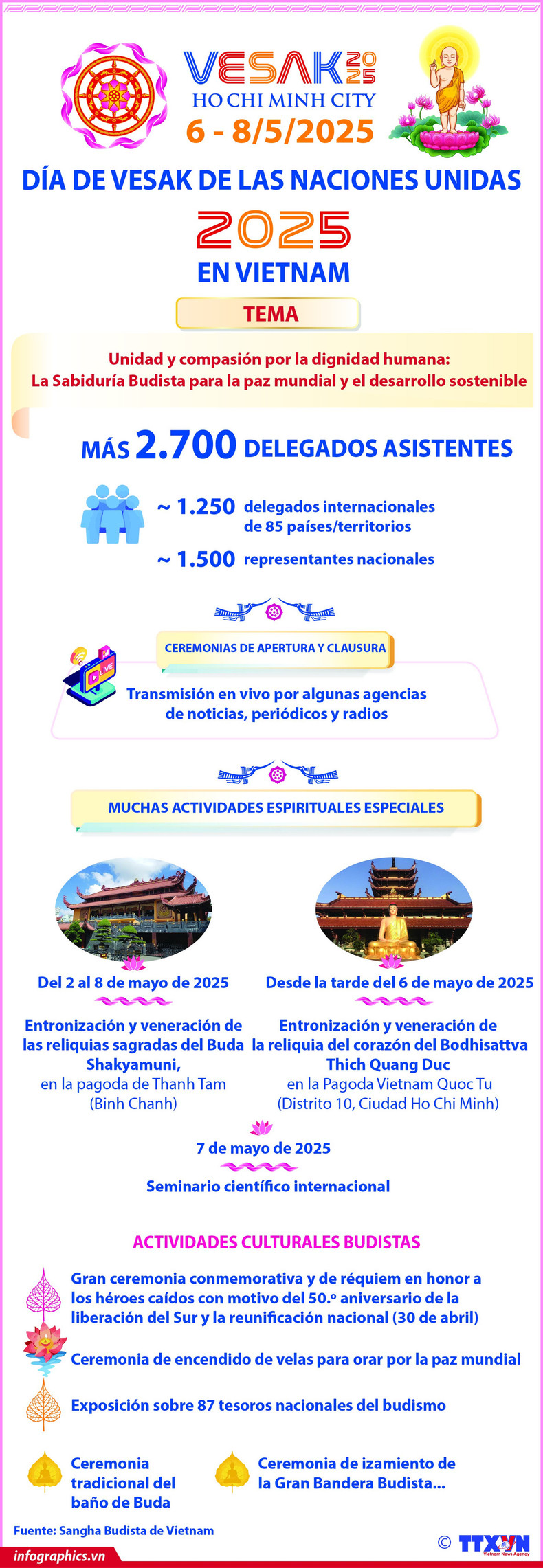 El Día de Vesak de las Naciones Unidas 2025 se celebra del 6 al 8 de mayo de 2025 en Ciudad Ho Chi Minh con la participación de dos mil 700 delegados, incluidos alrededor de mil 300 participantes internacionales. Esta es la cuarta vez que Vietnam acoge el Festival Vesak de las Naciones Unidas, después de 2008 en Hanói, 2014 en Ninh Binh y 2019 en Ha Nam.