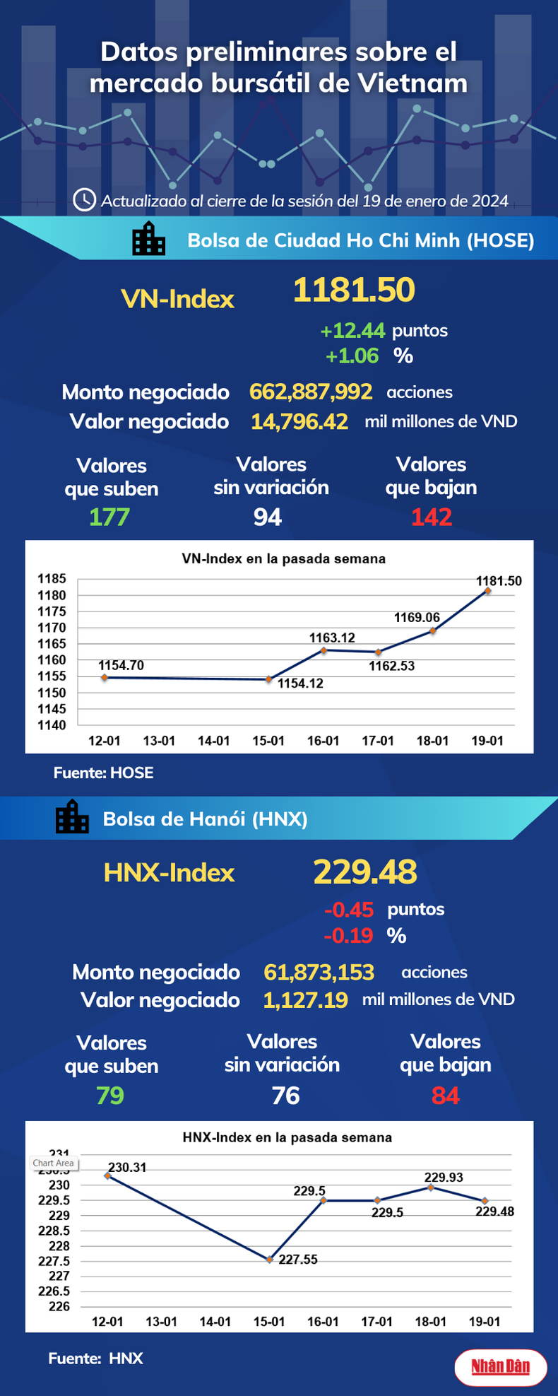Al cierre de la sesión del 19 de enero de 2024, la Bolsa de Ciudad Ho Chi Minh, en Vietnam, registró 177 valores que subieron, 142 que bajaron y 94 sin variación, mientras en Hanói las cifras marcaron 79, 84 y 76.