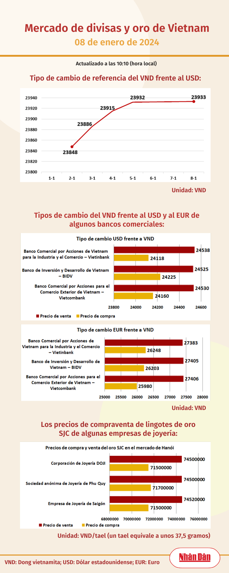 viernes, octubre 24, 2025 10:10 Infografía: Mercado de divisas y oro de Vietnam -24 de octubre de 2025 El dólar estadounidense se cotiza hoy en 24098 dongs vietnamitas (VND) (Referencia del Banco Estatal de Vietnam)