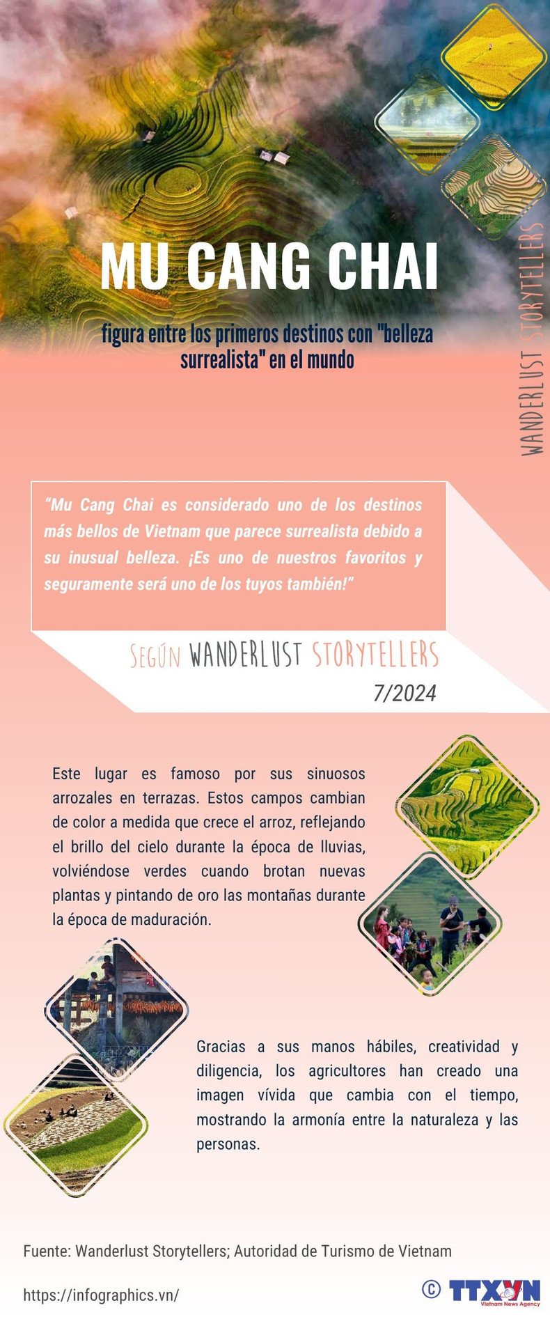 El distrito de Mu Cang Chai, de la norteña provincia vietnamita de Yen Bai, ocupó el primer lugar en la lista de 25 destinos con "belleza surrealista", según el sitio web de viajes Wanderlust Storytellers.