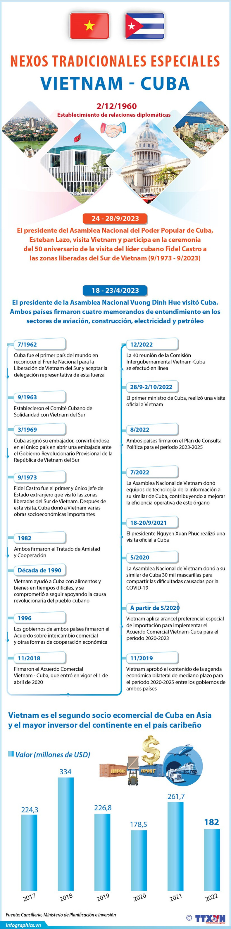 Las relaciones de solidaridad y confianza entre Vietnam y Cuba continúan creciendo con fuerza, volviéndose cada vez más sustantivas y eficaces. Ambos países han profundizado los nexos en los canales de la diplomacia del Partido, Estado y pueblo, y prestado atención a la cooperación económica, comercial y de inversión.