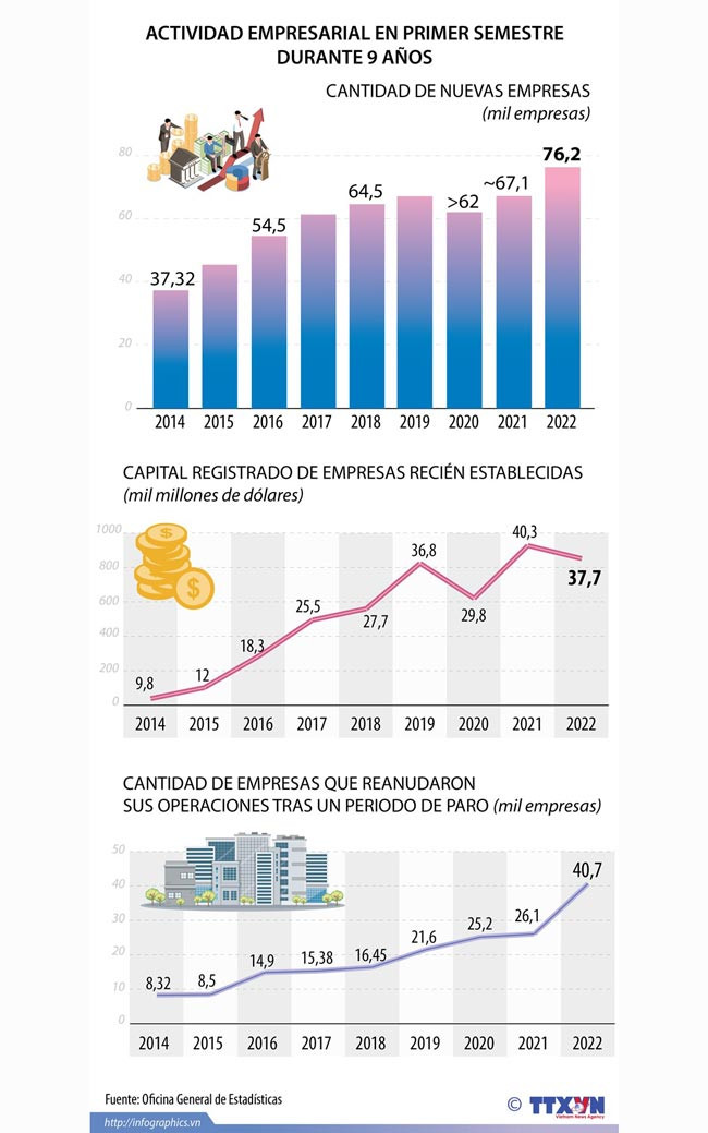 Vietnam registró 76 mil 200 nuevas empresas en el primer semestre de 2022, lo cual establece un nuevo récord en los últimos nueve años, según la Oficina General de Estadísticas.