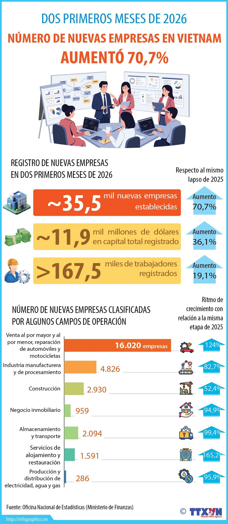 En los dos primeros meses de 2026 se crearon cerca de 35.500 nuevas empresas en todo Vietnam, lo que representa un aumento del 70,7 por ciento en comparación con el mismo lapso del año anterior.