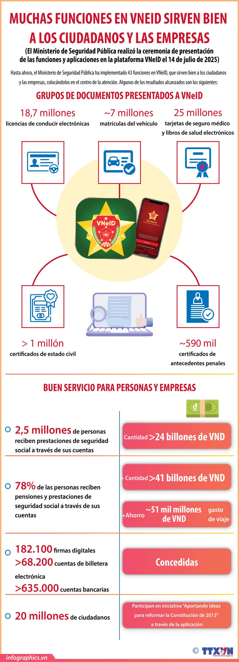 Hasta la fecha, el Ministerio de Seguridad Pública ha implementado 43 funciones en la plataforma VNeID, que prestan un servicio eficiente tanto a los ciudadanos como a las empresas, poniendo a estos como centro de atención.