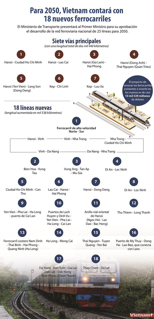 El Ministerio de Transporte presentará al primer ministro del país para su aprobación el desarrollo de la red ferroviaria nacional de 25 líneas para 2050, indicó la Agencia Vietnamita de Noticias.