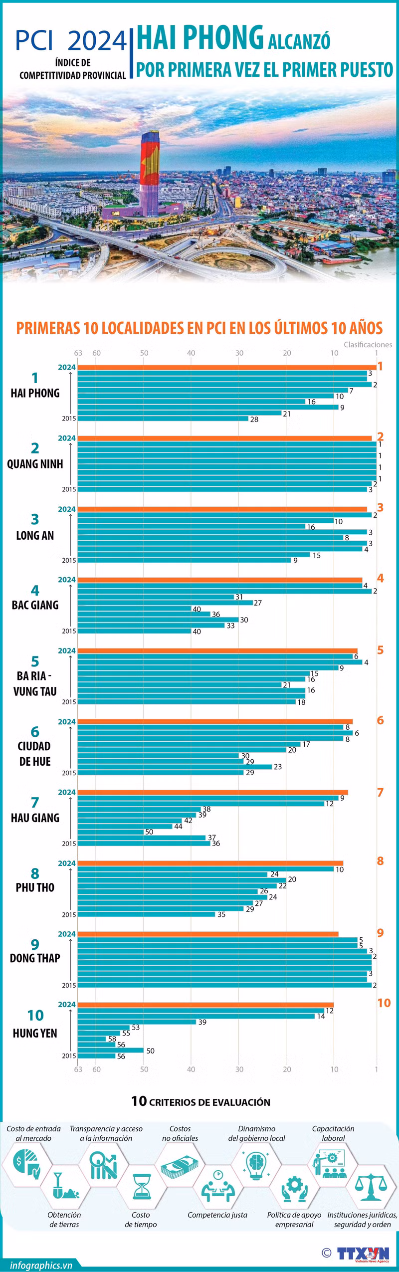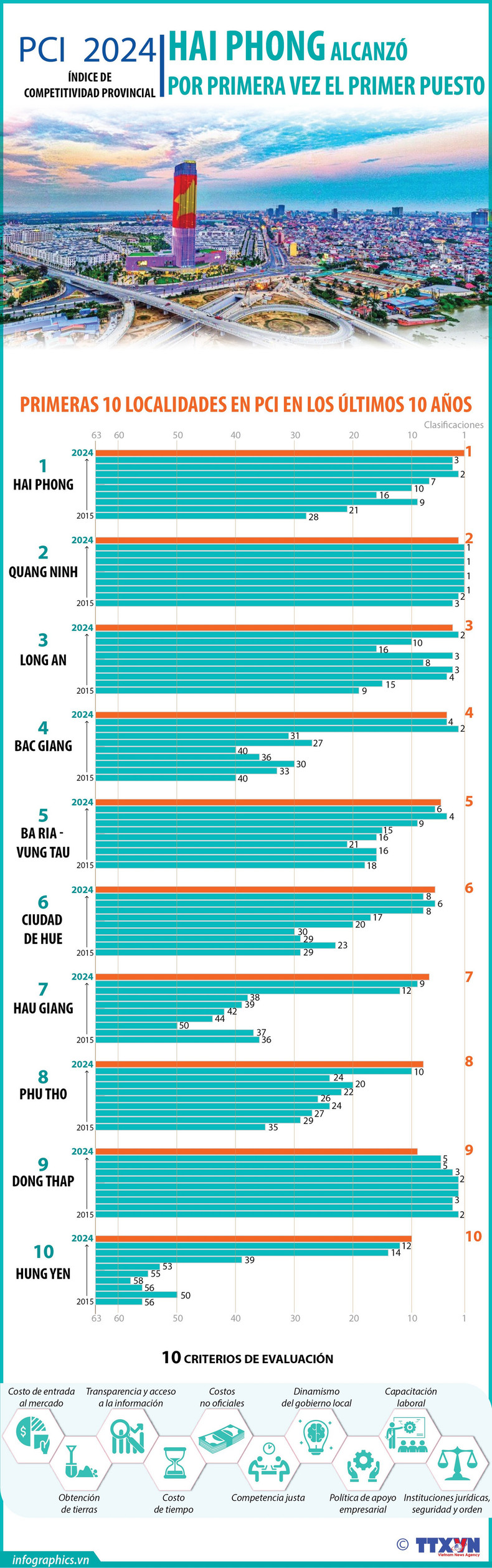 Según el ranking del Índice de Competitividad Provincial (PCI) 2024 de Vietnam, Hai Phong alcanzó por primera vez la posición líder con 74,84 puntos. Le siguen Quang Ninh con 73,20 puntos, Long An (72,64 puntos) y Bac Giang (71,24 puntos), además de otras localidades en el Top 10, como Ba Ria - Vung Tau, Hue, Hau Giang, Phu Tho, Dong Thap y Hung Yen.