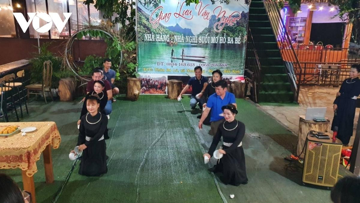 | Turistas aprenden a realizar tareas cotidianas de las minorías étnicas en Ba Be como segar arroz y cocinar, y observan productos artesanos elaborados por ellas. |