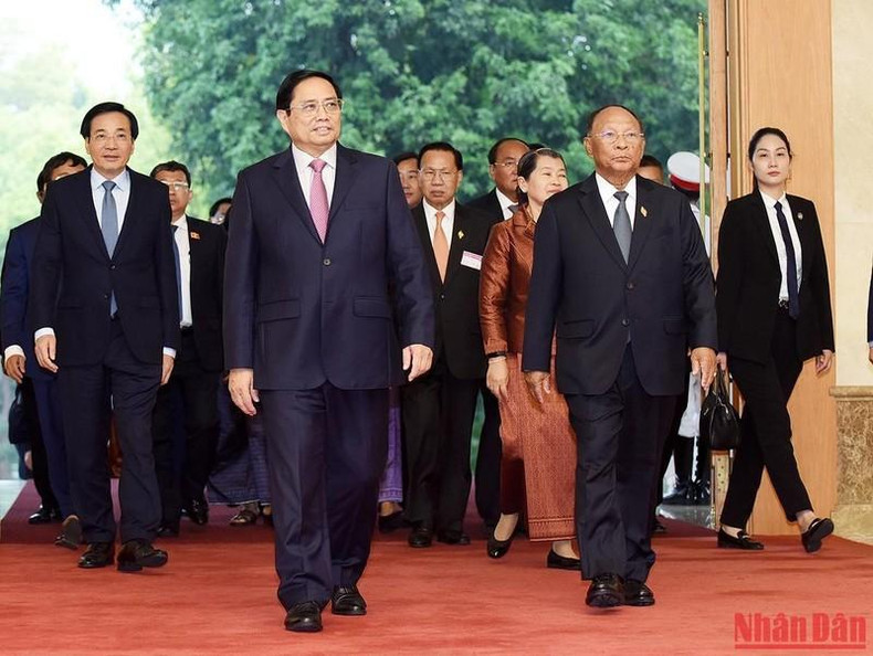 | El primer ministro de Vietnam, Pham Minh Chinh, y el presidente de la Asamblea Nacional de Camboya, Samdech Heng Samrin, comparecen ante la prensa previo a la reunión bilateral. |