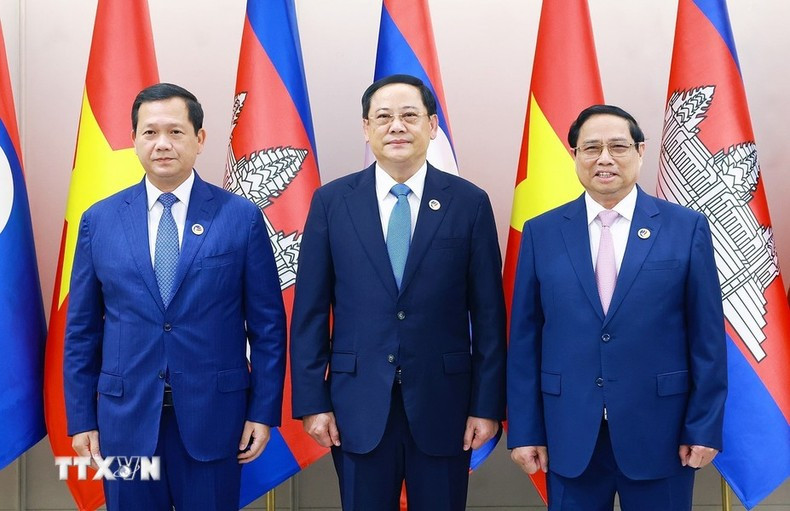 | Los premieres de Vietnam, Pham Minh Chinh; de Laos, Sonexay Siphandone; y de Camboya, Hun Manet (de la derecha a la izquierda). |