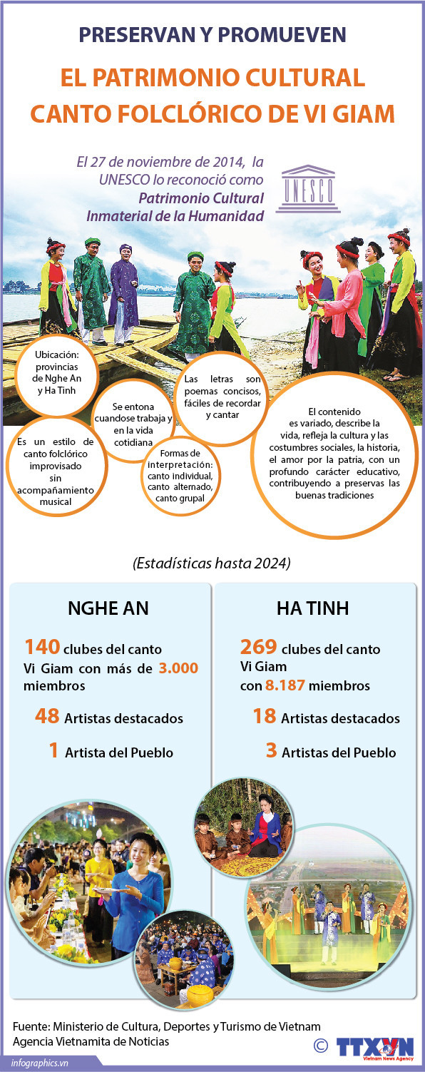 El "Vi Giam" es un estilo de canto folclórico improvisado sin acompañamiento musical que las comunidades de las centrales provincias vietnamitas de Nghe An y Ha Tinh entonan durante sus actividades cotidianas y jornadas de trabajo. Una década después de su reconocimiento por la Unesco como Patrimonio Cultural Intangible, los esfuerzos por preservarlo se realizan de manera integral, fortaleciendo la conciencia comunitaria y difundiendo ampliamente su valor tradicional.