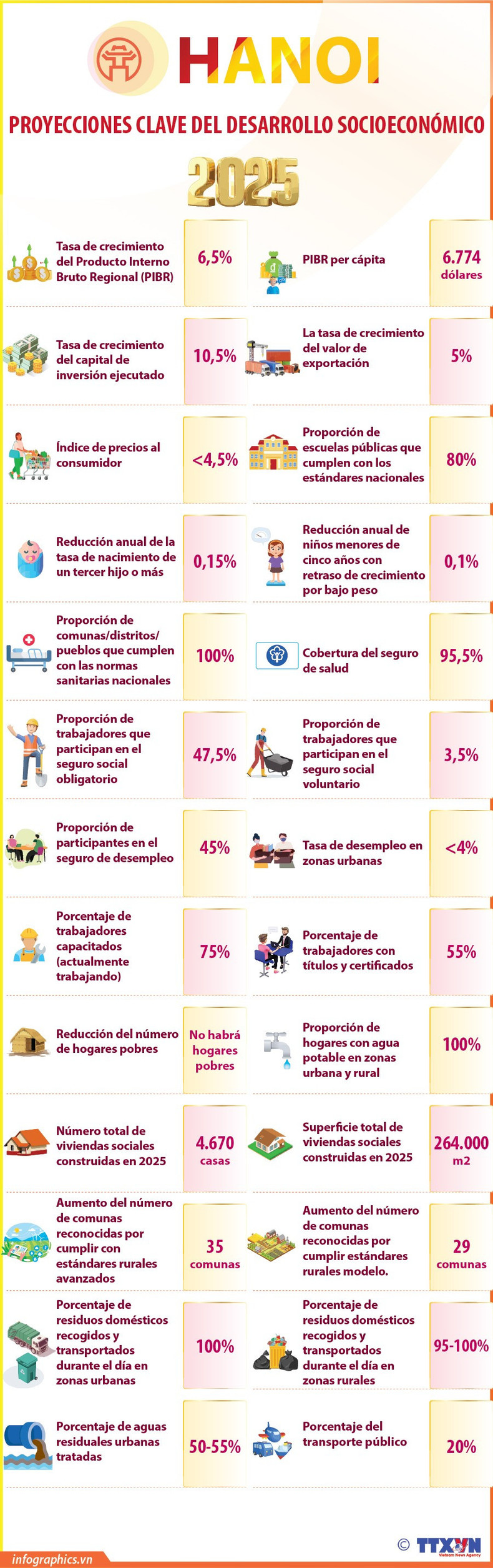 De acuerdo con la Resolución sobre el Plan de desarrollo socioeconómico en 2025 de Hanói, la capital vietnamita se fija objetivos importante como un crecimiento del Producto Interno Bruto Regional (PIBR) de más del 6,5 por ciento, un PIB per cápita que supere los seis 774 dólares y que la tasa del capital de inversión ejecutado aumente más del 10,5 por ciento, entre otros.