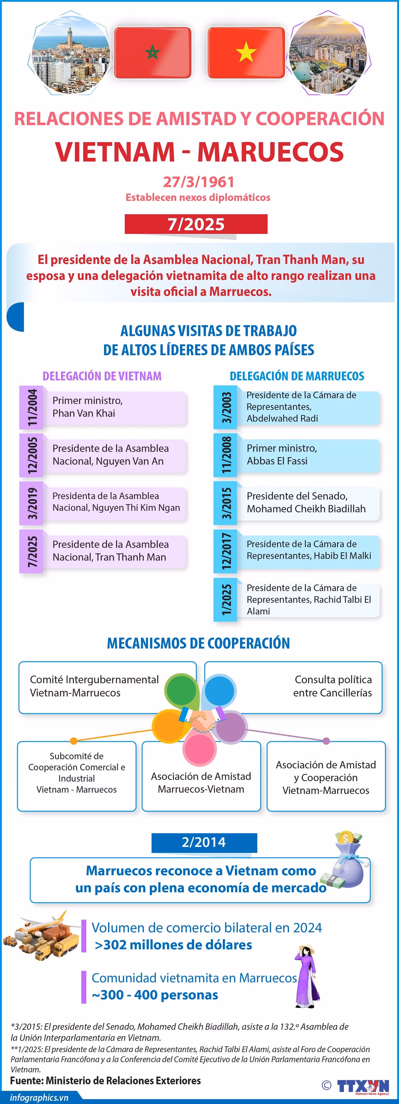 Esta es la primera visita oficial de un líder vietnamita a Marruecos en seis años y se enmarca en la preparación del 65º aniversario de las relaciones diplomáticas bilaterales en 2026, fortaleciendo los lazos de amistad y cooperación entre ambos países.
