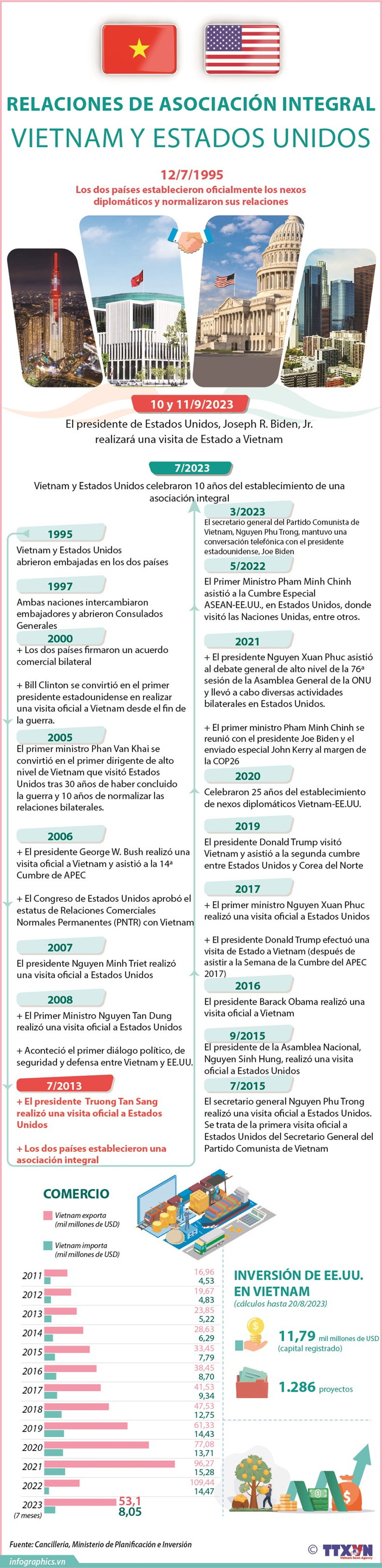 Tras 28 años desde el establecimiento oficial de relaciones diplomáticas y 10 años de la asociación integral, los nexos entre Vietnam y Estados Unidos han logrado un desarrollo integral y sustancial, contribuyendo activamente a la seguridad, la paz, la cooperación y desarrollo en la región y el mundo.