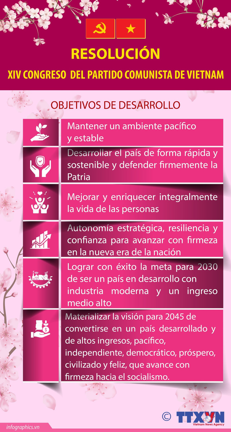 La Resolución del XIV Congreso Nacional del Partido Comunista de Vietnam establece los siguientes objetivos de desarrollo: mantener un entorno pacífico y estable; lograr un desarrollo nacional rápido y sostenible; y defender firmemente la Patria...