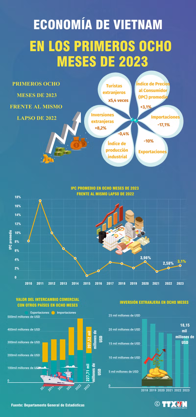 En los primeros ocho meses de 2023, el Índice de Precios al Consumidor (IPC) promedio ascendió un 3,1 por ciento, mientras que la inversión extranjera, un 8,2 por ciento; y los visitantes internacionales a Vietnam aumentaron 5,4 veces.