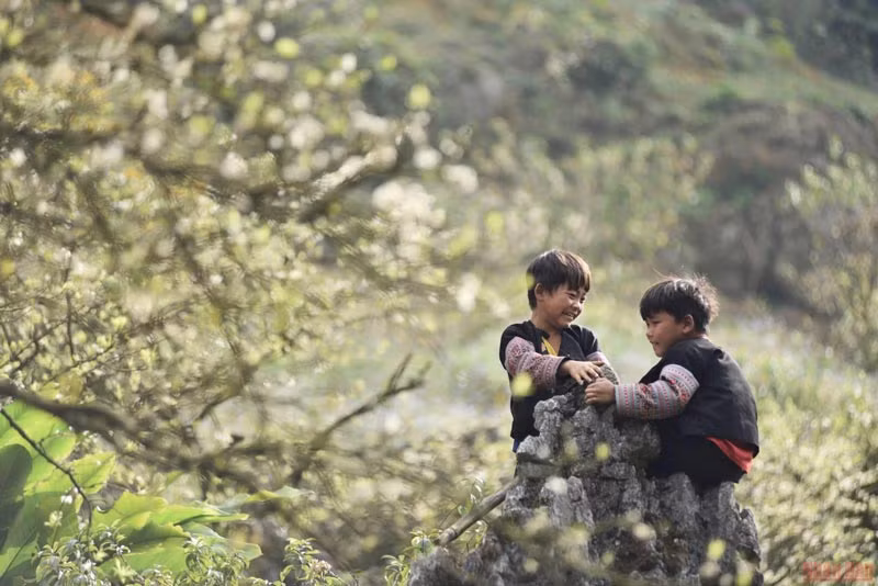 Los niños de la etnia Hmong juegan bajo los árboles de ciruelos.