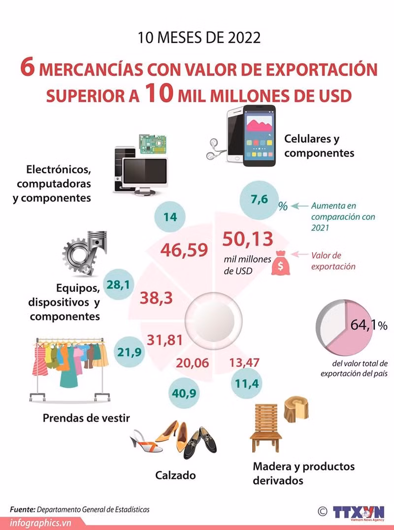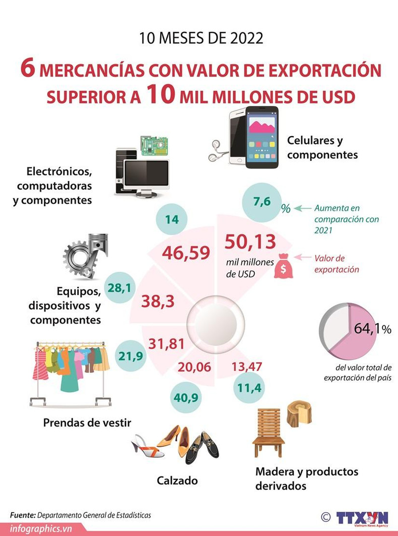 Vietnam registra seis mercancías con valor de exportación suprerior a 10 mil millones de dólares en los primeros diez meses de 2022, según la Agencia nacional de Noticias.