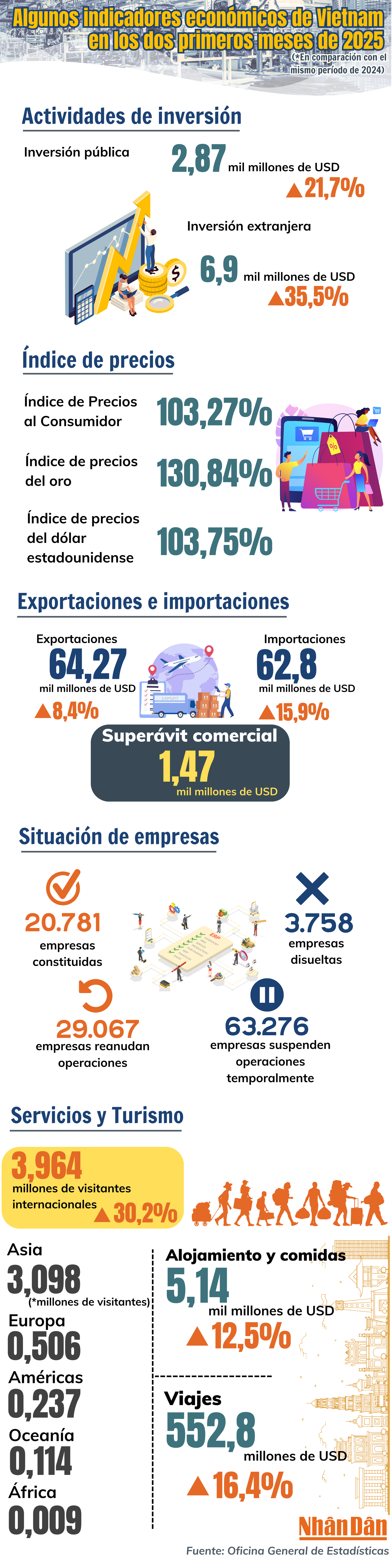 Según la Oficina General de Estadística, la economía vietnamita tuvo un comienzo positivo en los dos primeros meses de 2025 hacia el objetivo de un crecimiento de más del 8 por ciento en el año.