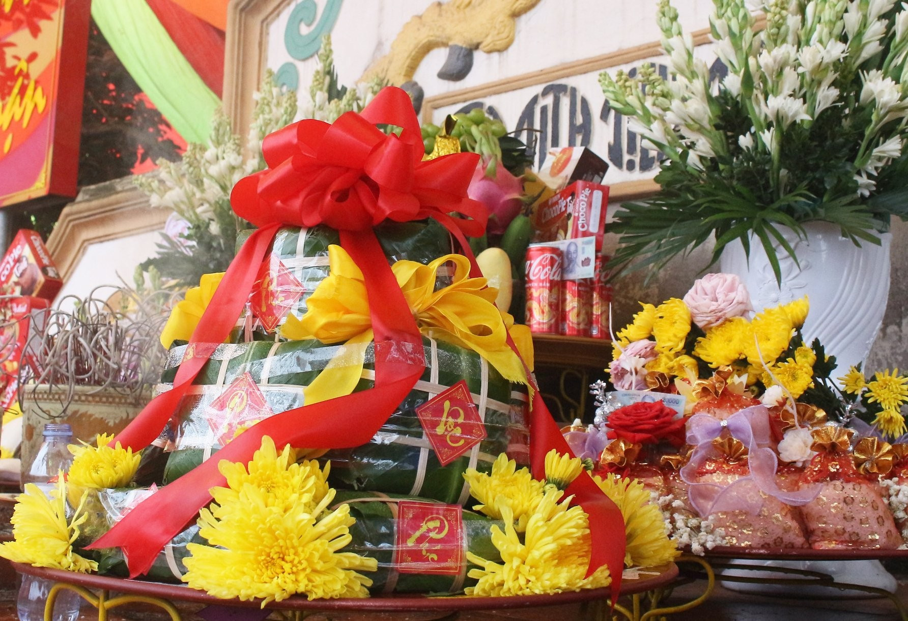 | Banh Chung y Banh Giay (pasteles cuadrados y redondos de arroz glutinoso) son dos ofrendas imprescindibles que hacen los lugareños para reconocer los méritos de los reyes Hung. |