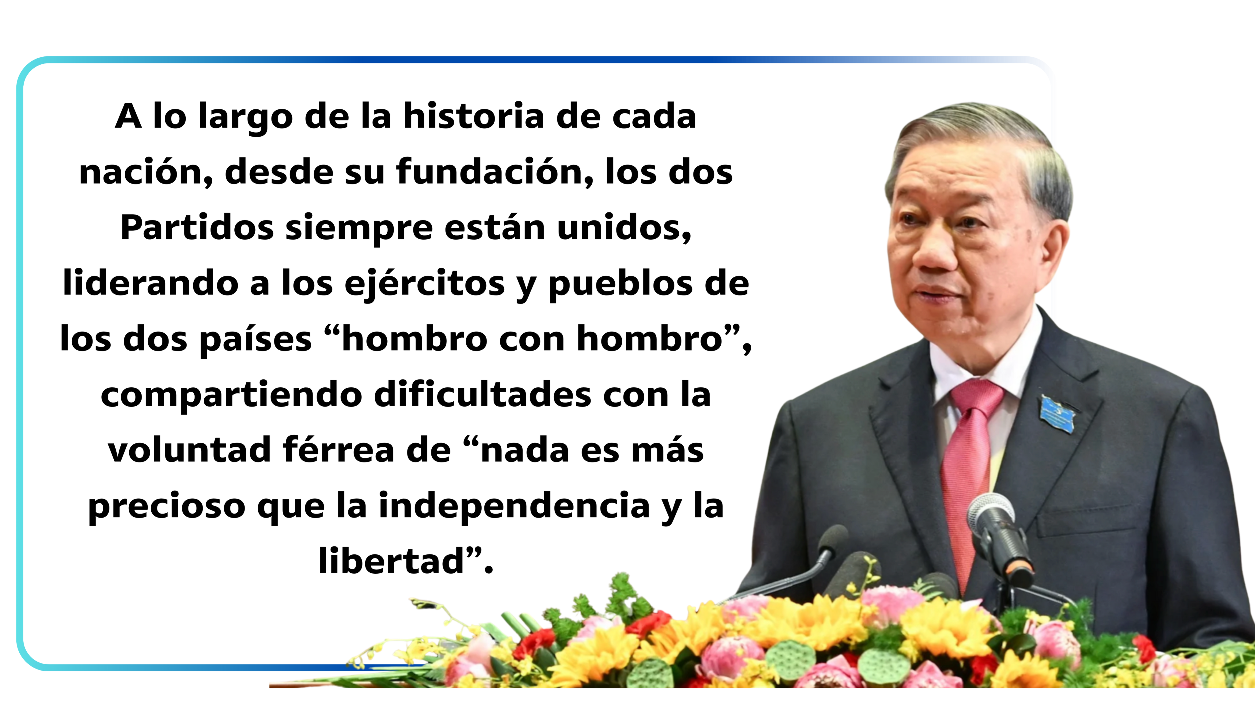 A lo largo de la historia de cada nación, desde su fundación, los dos Partidos siempre están unidos, liderando a los ejércitos y pueblos de los dos países “hombro con hombro”, compartiendo dificultades con la voluntad férrea de “nada es más precioso que la independencia y la libertad”, derrotando al enemigo común, logrando la victoria completa y liberando a sus respectivas naciones; al mismo tiempo, trabajando juntos para edificar, construir y desarrollar el país en la nueva situación.