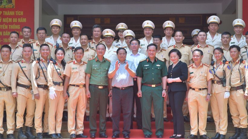 El primer ministro Pham Minh Chinh con oficiales y soldados de la policía provincial de Dak Lak. (Foto: Nhan Dan)