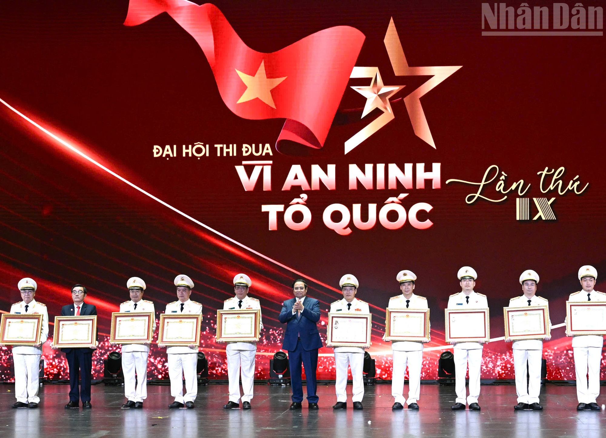 El primer ministro Pham Minh Chinh entrega el título de Héroe de las Fuerzas Armadas Populares y la Medalla de Mérito Militar de Primera Clase a colectivos e individuos con logros sobresalientes. (Foto: Nhan Dan)