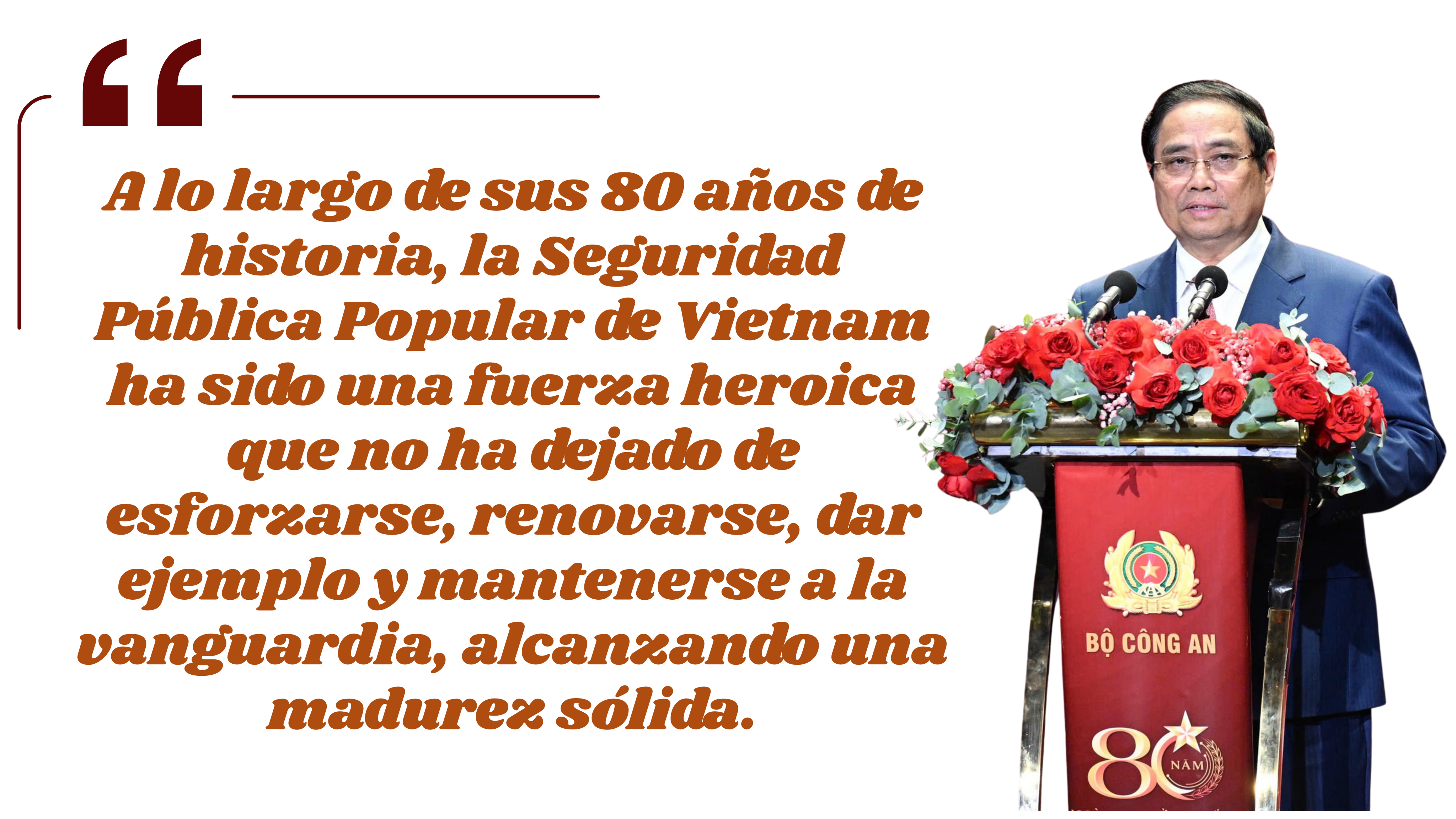 1. Desde su fundación el 19 de agosto de 1945, la Seguridad Pública Popular, en cualquier lugar, circunstancia y condición, siempre ha sido “la espada sagrada” del Partido y del Estado, el sólido “escudo de acero” en la protección de la seguridad nacional, combatiendo todo tipo de crimen para preservar la paz, la felicidad y la prosperidad del pueblo. Esta labor reafirma su gloriosa y heroica tradición, su carácter revolucionario valiente y su fuerte capacidad combativa, consolidándola como una fuerza armada clave, absolutamente leal a la Patria, al Partido, al Estado y al pueblo.