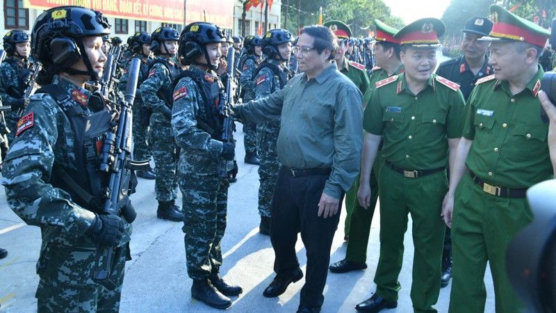 El primer ministro Pham Minh Chinh alenta a las fuerzas de Seguridad Pública Popular que participan en el ensayo general para el desfile por el 50 aniversario de la Liberación del Sur y la Reunificación Nacional (Foto: THANH GIANG).