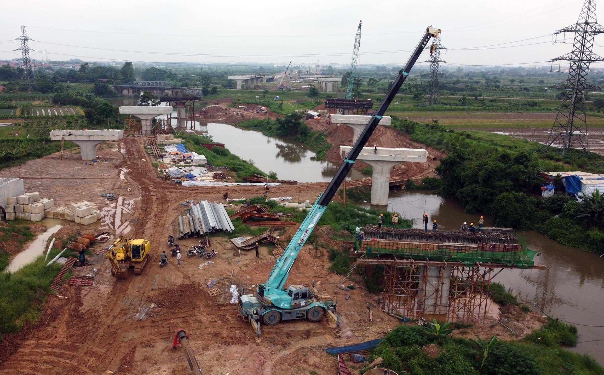 Construcción de un paso elevado sobre un ferrocarril en el paquete número 8 de la carretera de circunvalación 4 - Región Capital, en el distrito de Me Linh. (Foto: Huy Hung)