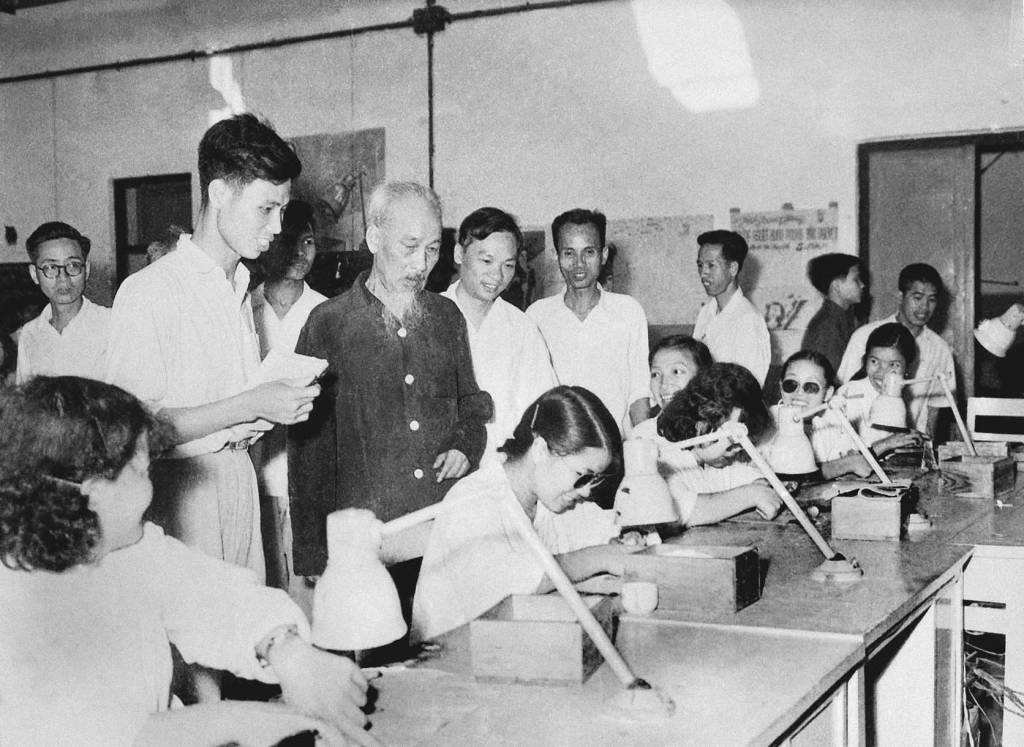 El Presidente Ho Chi Minh visita la fábrica de bombillas y termos de Rang Dong, Hanói (28 de abril de 1964).