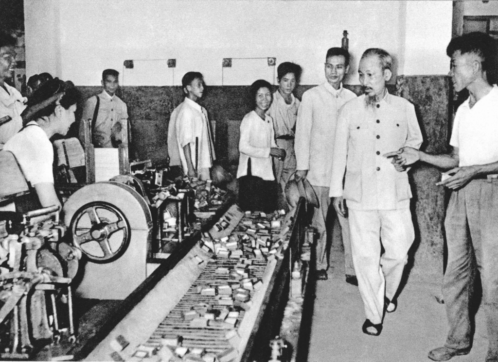 El Presidente Ho Chi Minh visita la fábrica de cerillas Thong Nhat de Hanói, el 16 de agosto de 1956.