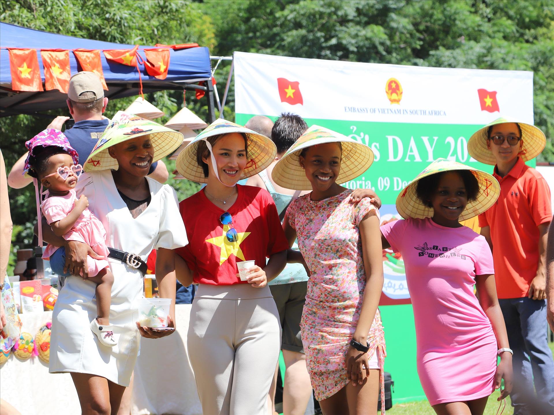 Amigos sudafricanos se toman fotos de recuerdo con sombreros cónicos vietnamitas en el evento del Día del Pho de Vietnam en Sudáfrica 2023. (Foto: VNA)