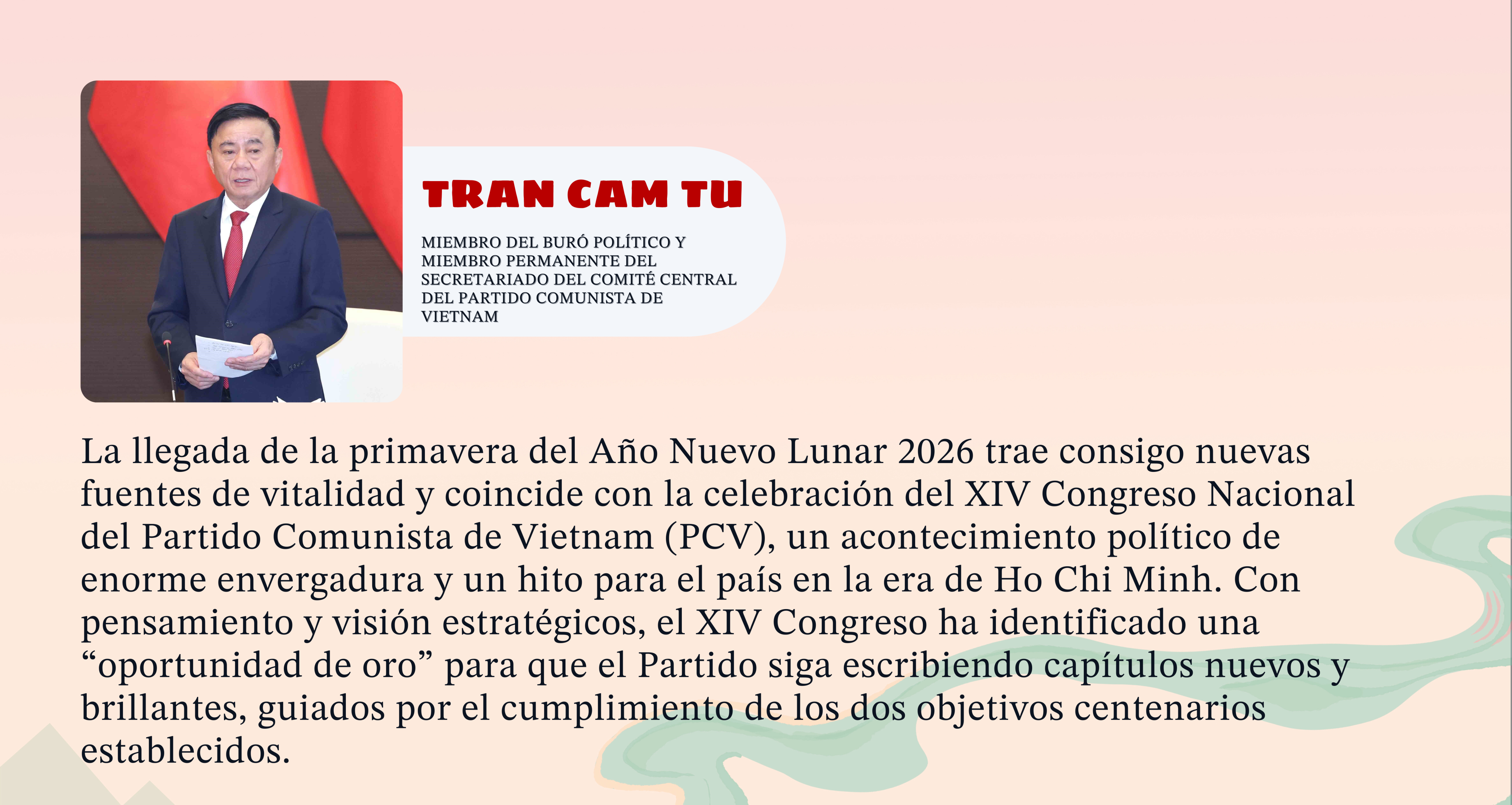 La llegada de la primavera del Año Nuevo Lunar 2026 trae consigo nuevas fuentes de vitalidad y coincide con la celebración del XIV Congreso Nacional del Partido Comunista de Vietnam (PCV), un acontecimiento político de enorme envergadura y un hito para el país en la era de Ho Chi Minh. Con pensamiento y visión estratégicos, el XIV Congreso ha identificado una “oportunidad de oro” para que el Partido siga escribiendo capítulos nuevos y brillantes, guiados por el cumplimiento de los dos objetivos centenarios establecidos.