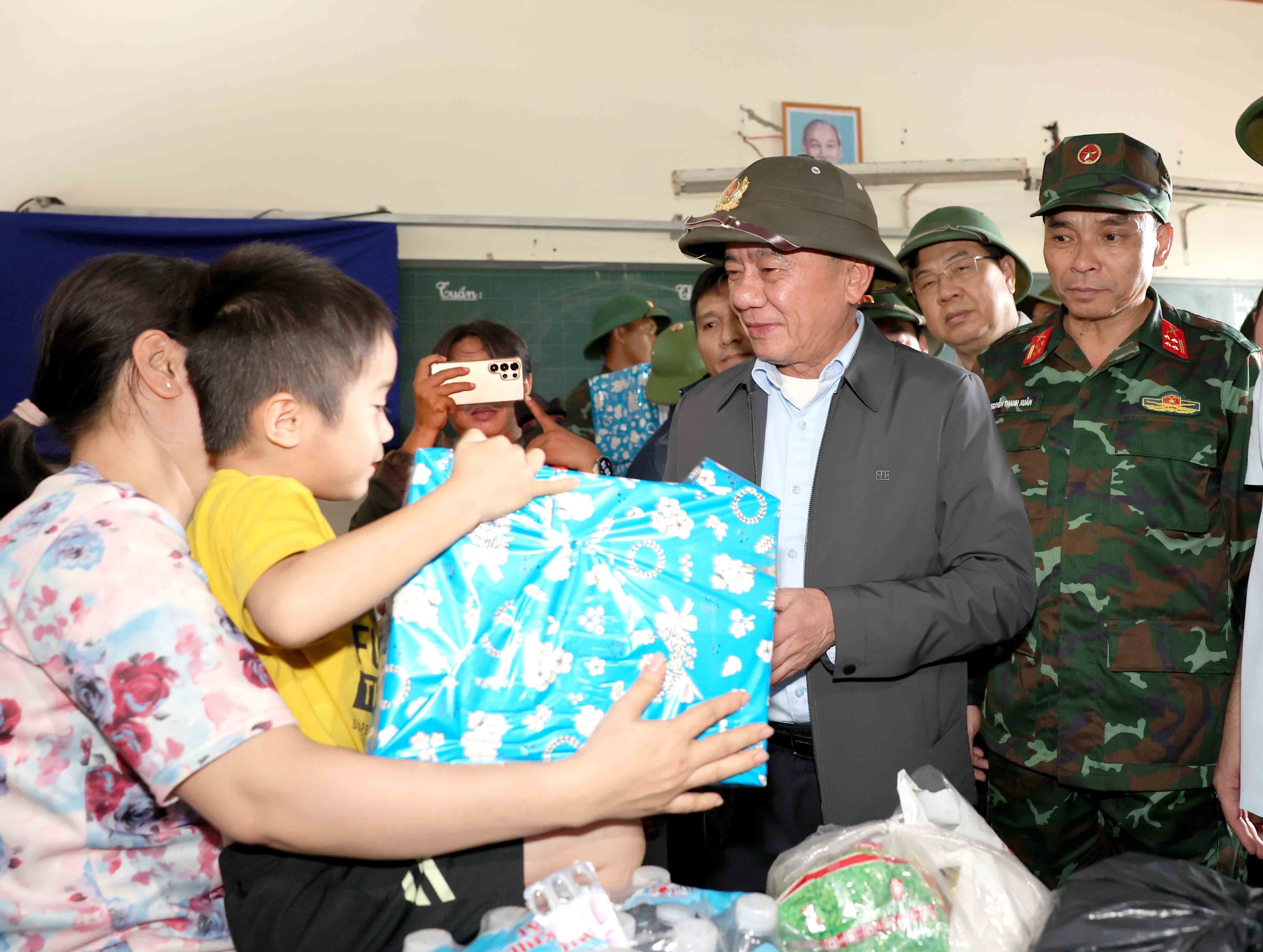 Tran Cam Tu, miembro permanente del Secretariado del Comité Central del PCV, entrega donaciones a los ciudadanos afectados por inundaciones en la comuna de Dien Dien, provincia de Khanh Hoa. (Foto: VNA)