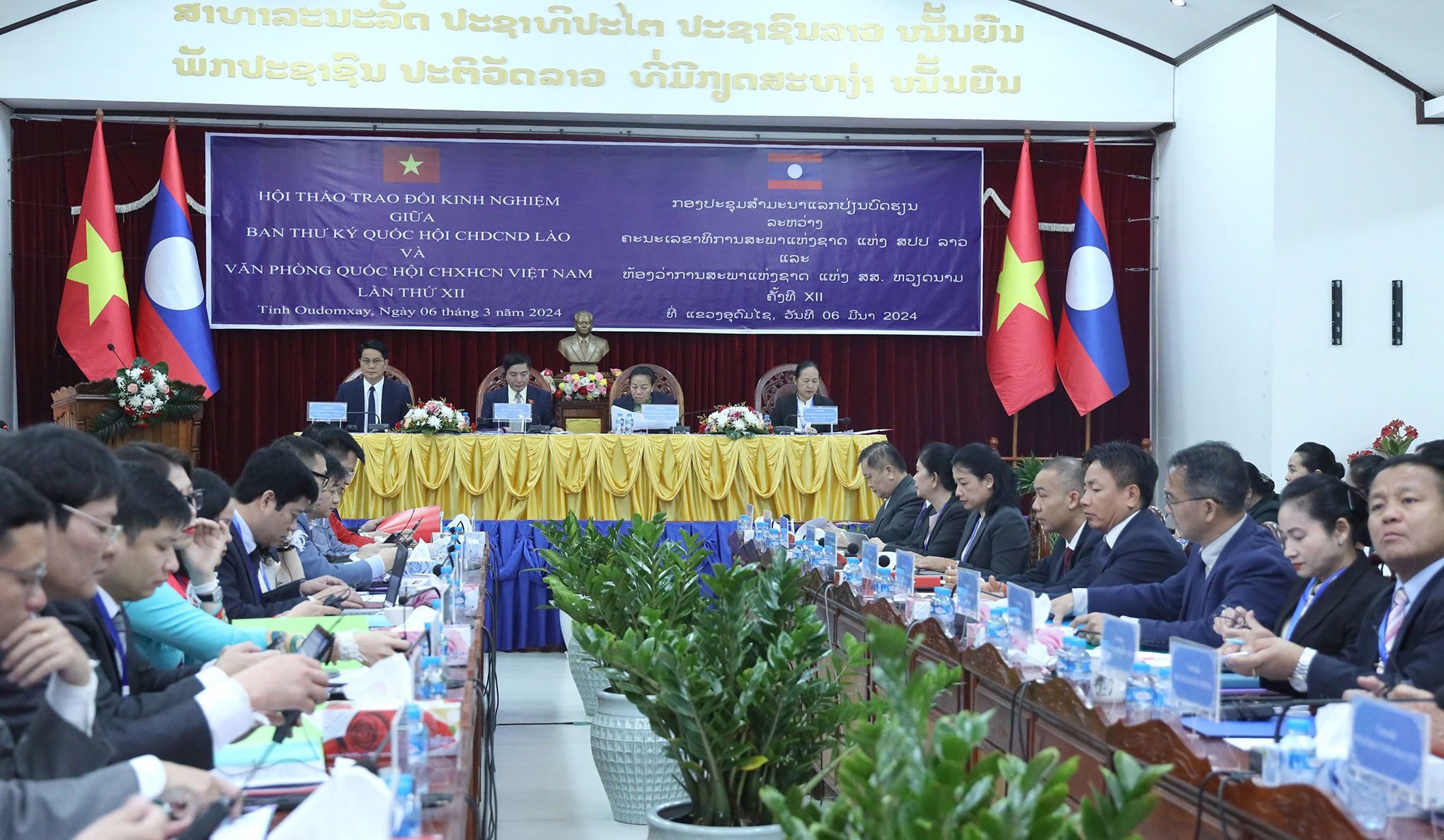 Seminario de intercambio de experiencias laborales entre el Secretariado del Parlamento laosiano y la Oficina de la Asamblea Nacional de Vietnam, en la provincia laosiana de Oudomxay, el 6 de marzo de 2024. (Foto: Quochoi.vn)