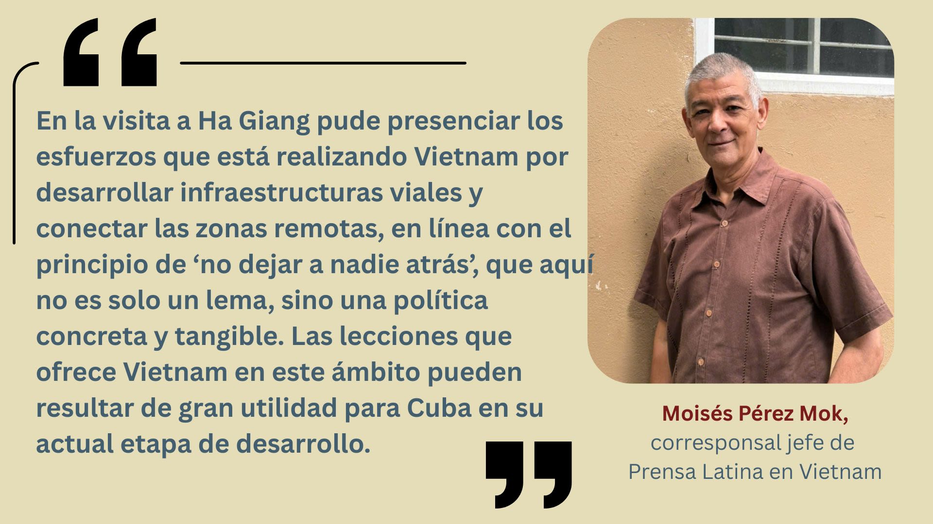 Además de dar seguimiento y cobertura exhaustiva de la vida política, económica y social en Vietnam, Moisés ha dedicado tiempo a conocer de cerca la realidad del país, visitando distintas localidades. Durante un viaje de trabajo a la provincia montañosa de Ha Giang, organizado por el Departamento de Prensa del Ministerio de Relaciones Exteriores, tuvo la oportunidad de conocer de primera mano la vida de las comunidades étnicas que habitan esta zona. "En esta visita pude presenciar los esfuerzos que está realizando Vietnam por desarrollar infraestructuras viales y conectar las zonas remotas, en línea con el principio de ‘no dejar a nadie atrás’, que aquí no es solo un lema, sino una política concreta y tangible", enfatizó. A su juicio, las lecciones que ofrece Vietnam en este ámbito pueden resultar de gran utilidad para Cuba en su actual etapa de desarrollo.